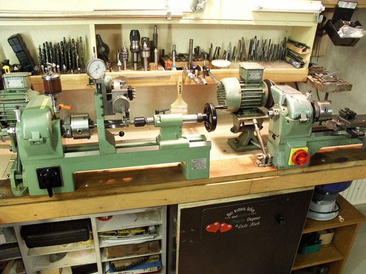 Die beiden baugleichen Mechaniker-Drehmaschinen von der Firma G. Saupe aus Leipzig in Industriequalität (hier kann sich die neue Welt ein paar Scheiben abschneiden) sind in einer Flucht angeordnet. Hülsensitze drehen ist kein Problem mehr. Die Eine macht die Arbeit, die Andere verhindert das Schlagen.